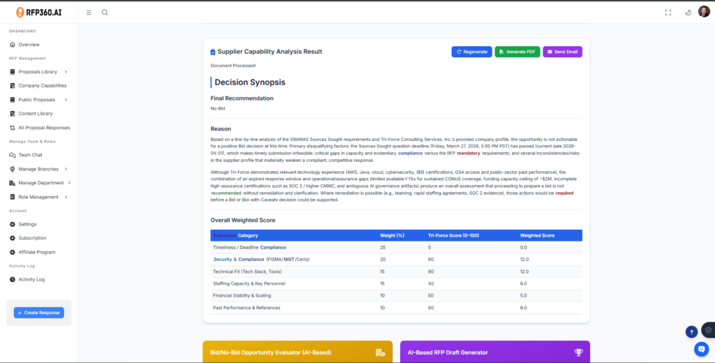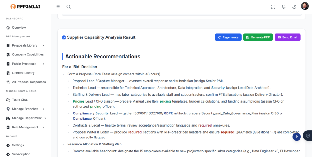 The AI evaluates supplier proposals against your specific requirements to recommend a definitive “Go” or “No-Go” decision.