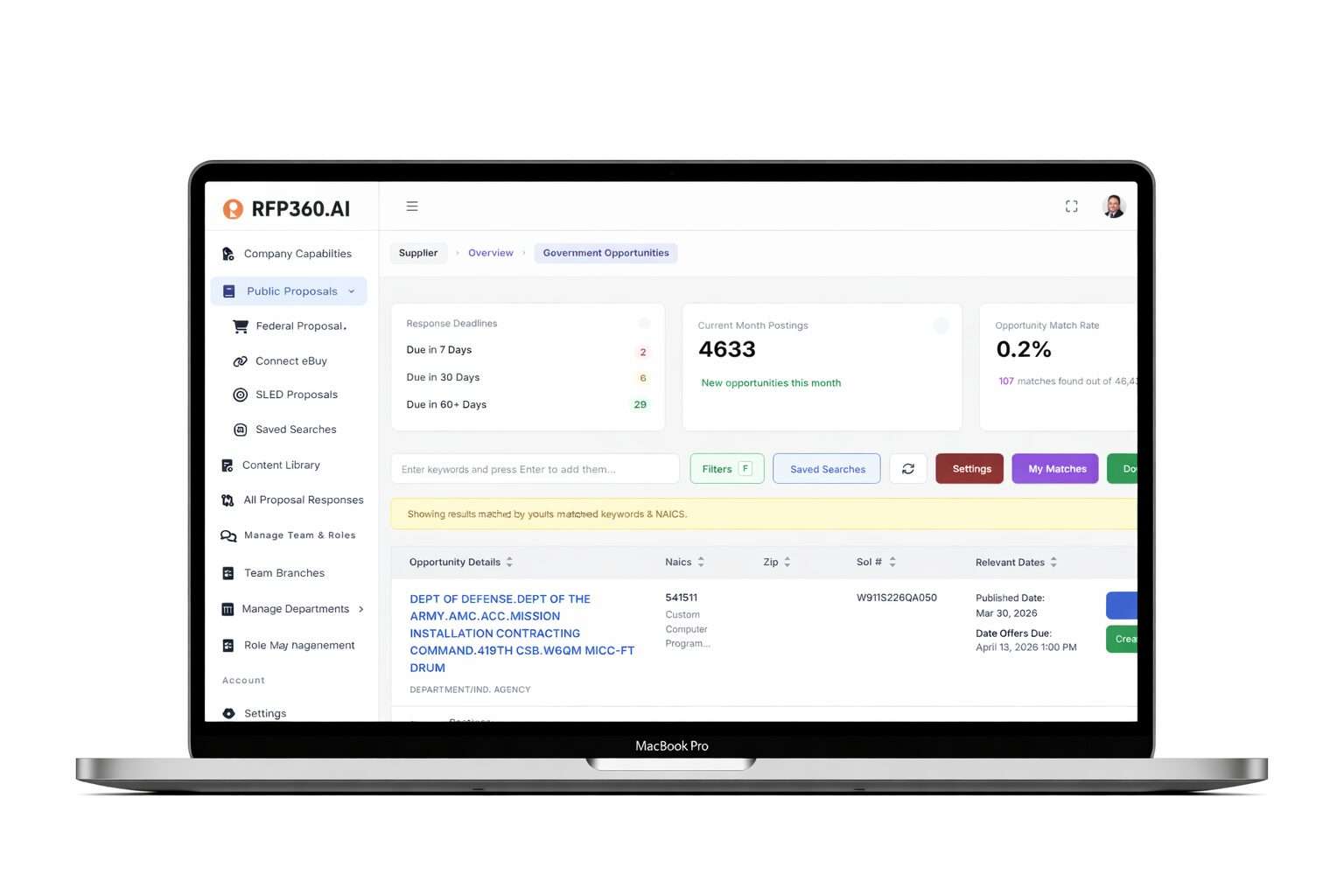 Streamline your response process for Federal, SLED, and GSA eBuy opportunities. RFP360.ai uses intelligent automation to help you build compliant, high-scoring bids in half the time.