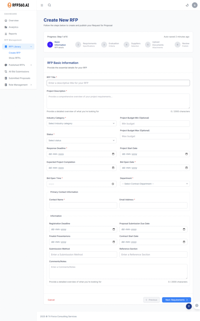 Every organization’s RFP challenges are different — but the goals are the same: faster processes, stronger compliance, smarter decisions, and better outcomes. whether you’re a government agency issuing highly regulated tenders, a procurement team sourcing strategic vendors, or a mid-sized business scaling your bid operations, RFP360.AI is built to deliver results that match your mission.