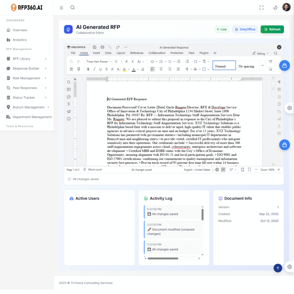 For mid-sized companies, the challenge isn’t just winning RFPs – it’s doing so efficiently, without expanding headcount or ballooning costs. RFP360.AI levels the playing field by automating repetitive tasks, guiding decision-making, and providing enterprise-grade tools that scale with your business.