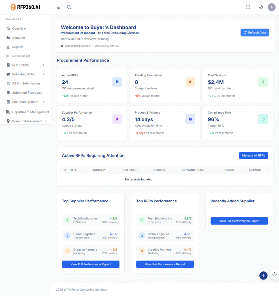 Procurement has evolved beyond cost savings — it’s now a strategic function that drives innovation, risk mitigation, and competitive advantage. RFP360.ai equips sourcing teams with advanced tools to not just manage RFPs, but to optimize them as a strategic lever for growth.